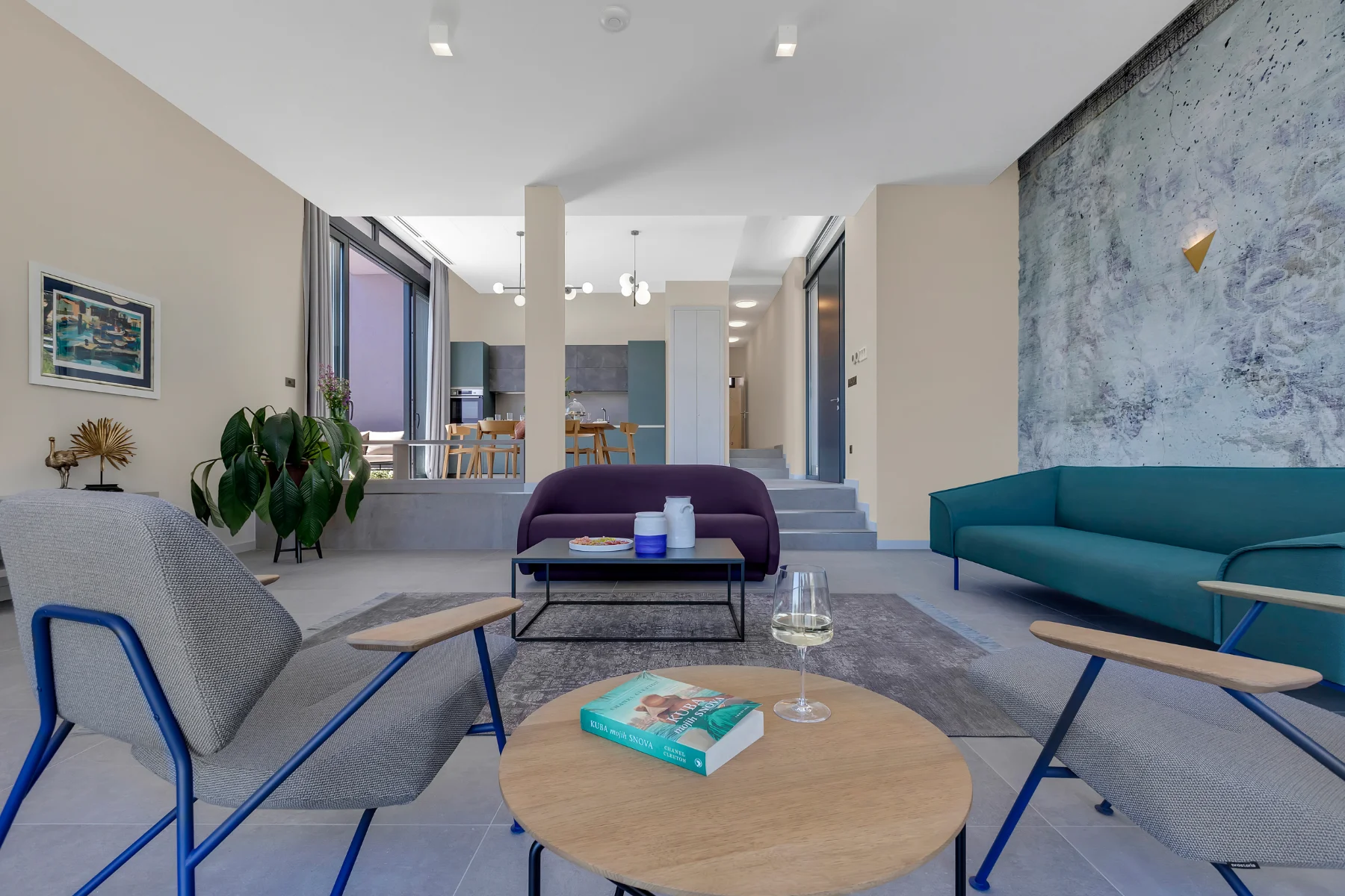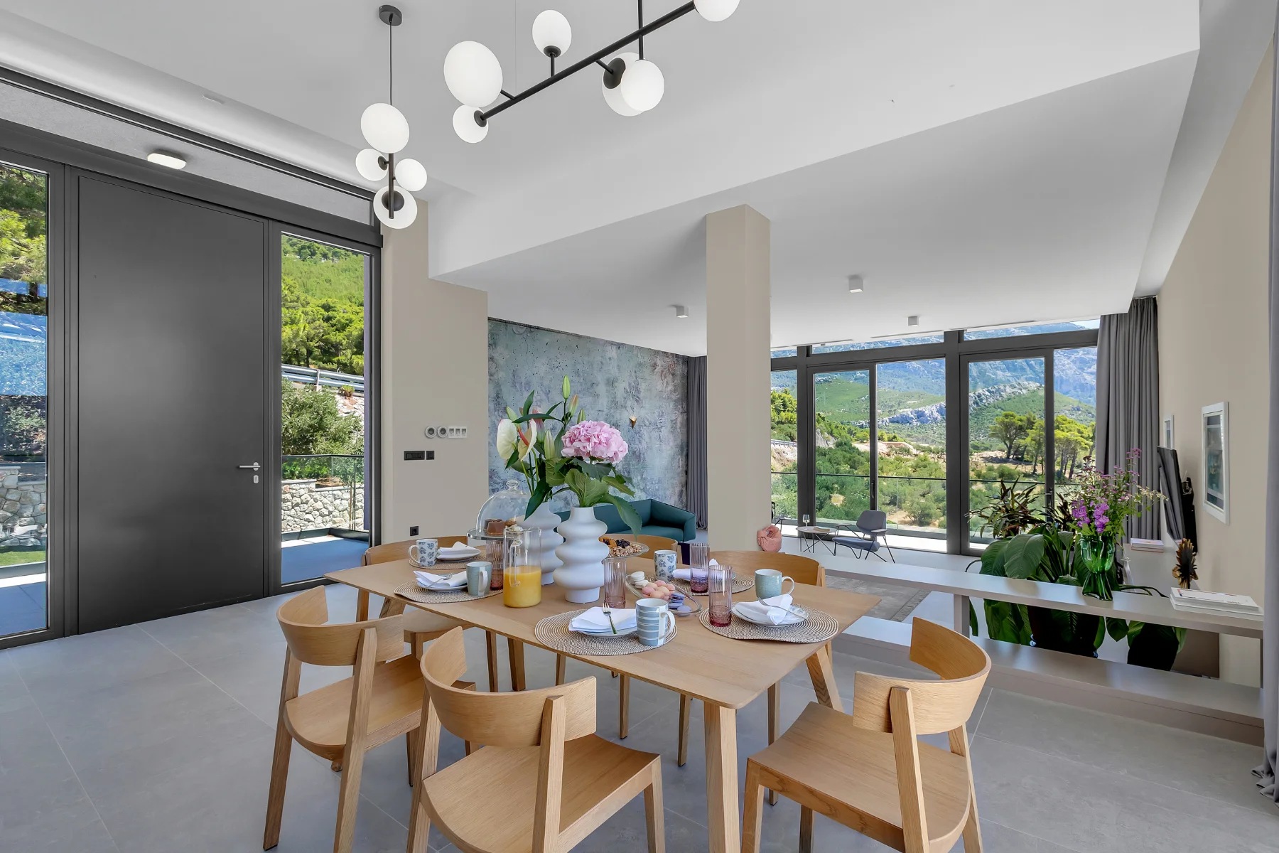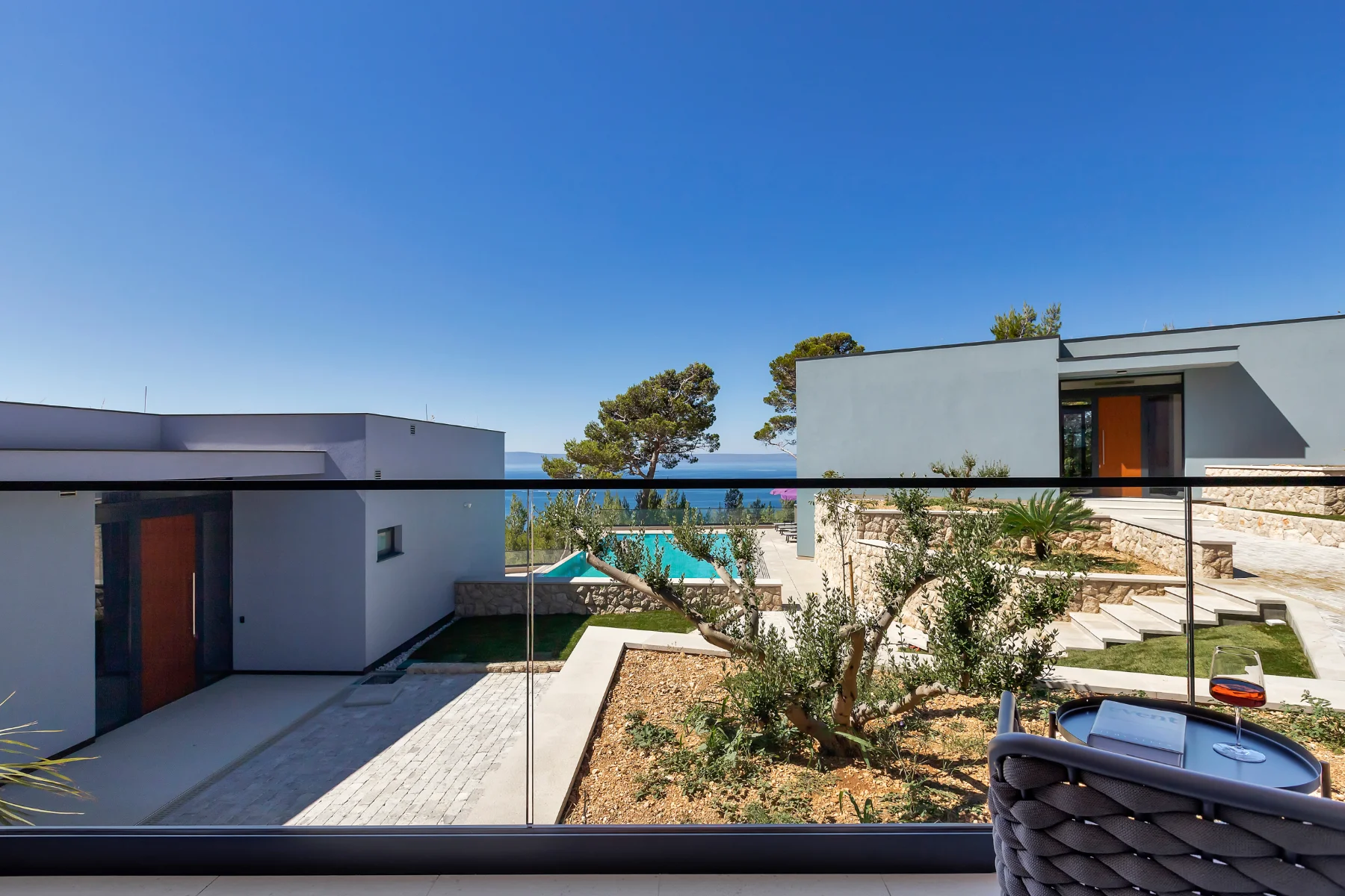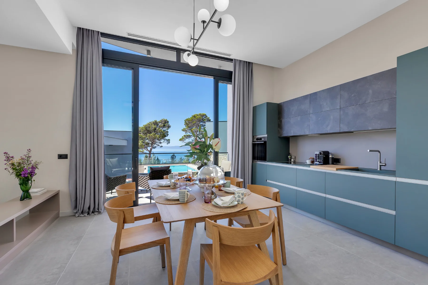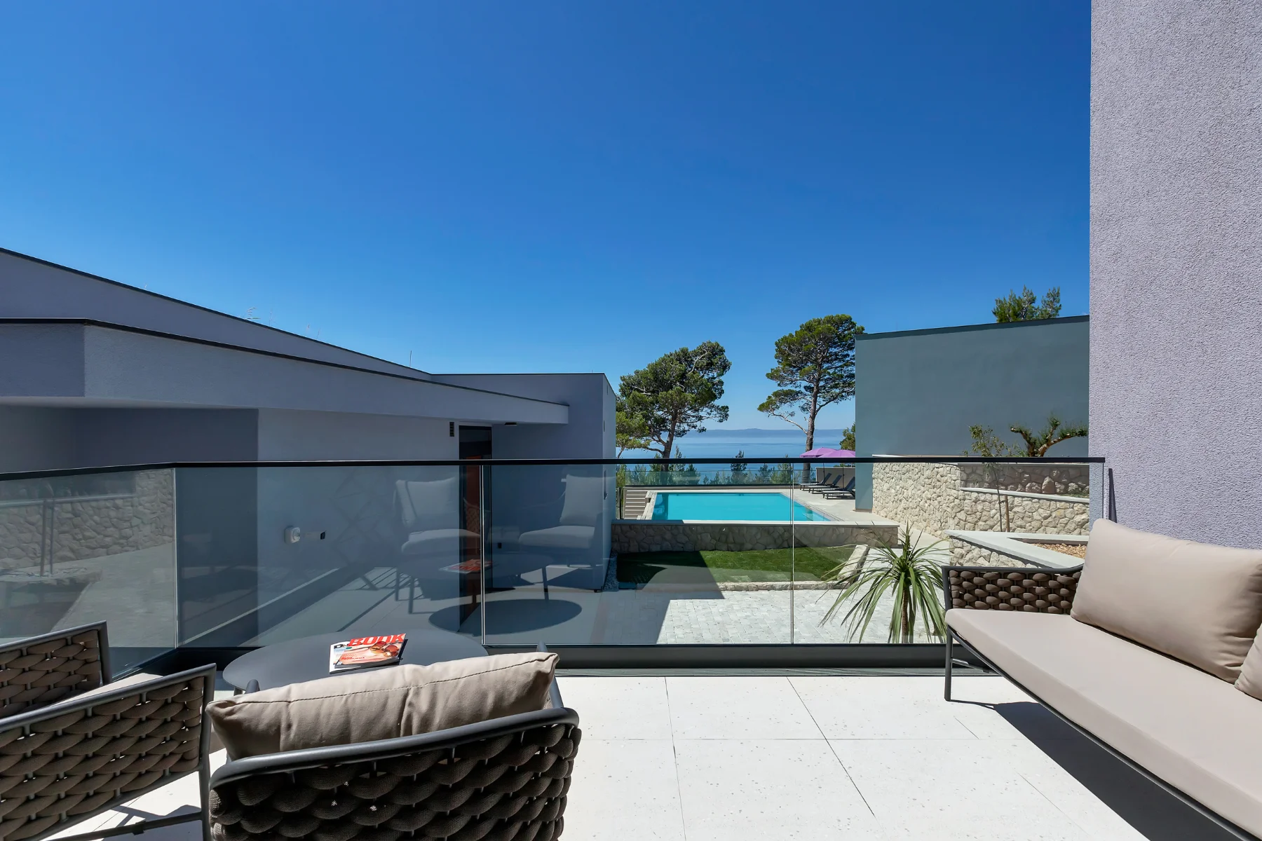 This luxury villa with a pool provides an abundance of possibilities to enjoy delicious meals and fun get-togethers. Prepare a sumptuous breakfast, tasty snacks, or a romantic dinner and dine in the comfort of a spacious dining room or at one of the balconies and terraces with a spectacular view. Whip up a pitcher of refreshing lemonade to cool off during hot summer days, or marvel at the stunning sunset, lounging with a favorite cocktail in your hands. The cozy atmosphere of the spacious living room is perfect for a joint movie night. The deckchairs by the pool are an irresistible place for pleasant evening gatherings.